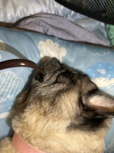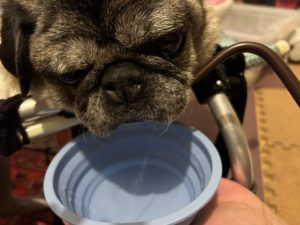 小桃は寝たきりではありませんのでモデルだけですが、寝たきりのワンコで体を起こすのが難しい場合はこの方法でお水を飲ませたりお口を洗う事が出来ます。