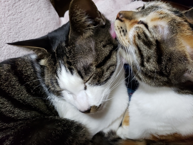 猫同士で行う毛繕いは「アログルーミング」と呼ばれ、特に顔や頭など、自分では届きにくい部位を重点的に舐めます。