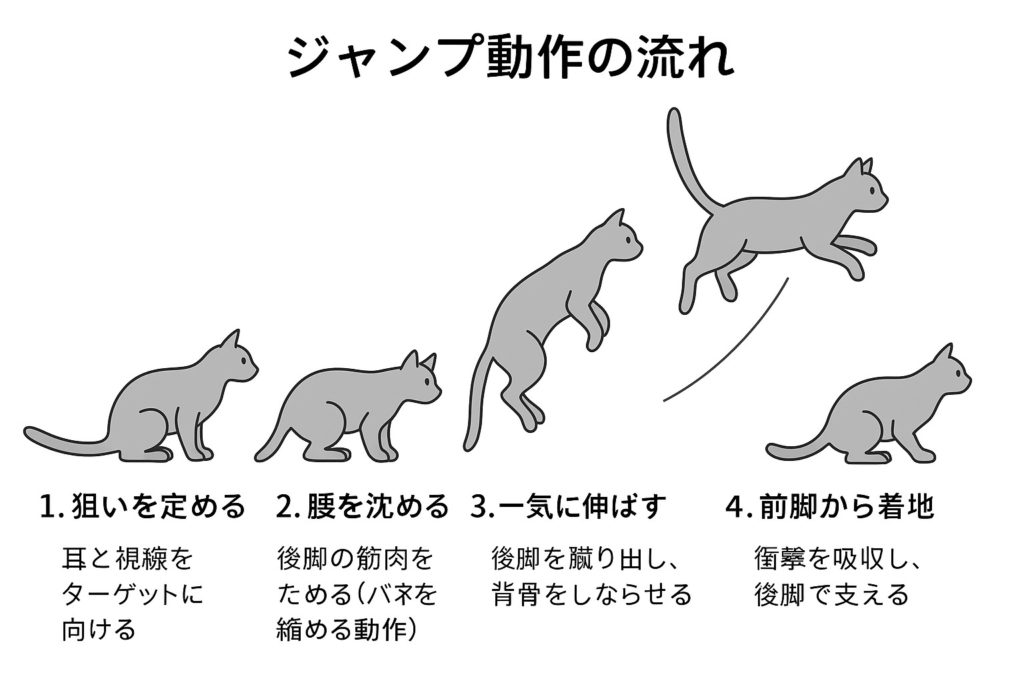 猫のジャンプを支えているのは、発達した後肢の筋肉です。特に大腿二頭筋・大腿四頭筋・腓腹筋(ふくらはぎの筋肉)が強力で、これらが一気に収縮することで爆発的な推進力を生み出します。また、腰椎(腰の骨)が柔軟で、背骨がバネのようにしなるため、踏み切りから着地までの動作が非常にスムーズです。