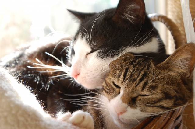・猫:快適な場所を探して、丸まって眠る。日なたや毛布の上が定位置。
