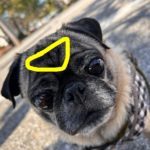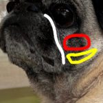 その下の黄色で囲ったエリアが肺で、白い線で書いたマズルの横から口の端にかけてのラインが大腸です。(パグはマズルが短いので分かりにくくて申し訳ないです)
