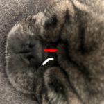 眉間の少し下からマズルの真ん中くらいまでが膵臓の反射区です。「うちの子、ちょっとここの被毛が薄いかも?カサカサしてるかも?」「皮膚の色がくすんでるかも」と言う時は消化に負担が少ないご飯にしたり、おやつを控えるなどしてあげて下さい。